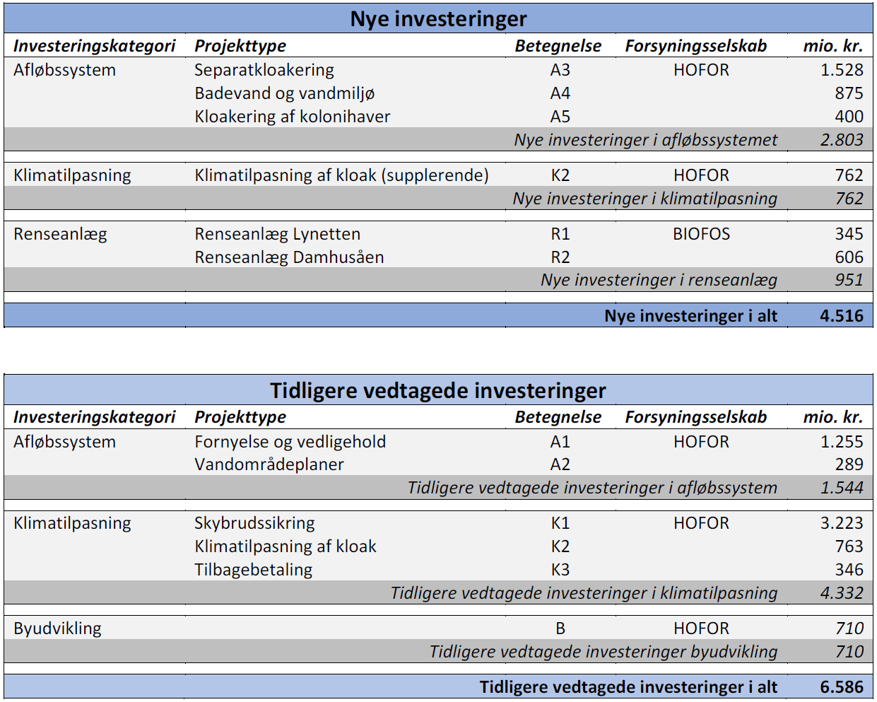 Skemaerne viser de forventede anlægsinvesteringer i spildevandsplanens planperiode, 2019-2028. Investeringerne gælder for forsyningsselskaberne HOFOR og BIOFOS.