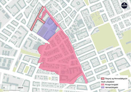 Kort over skybrudsoplande til projektet. Det blå opland fra Amagerbrogade er på omtrent 15 ha og oplandet fra Skotlandsplads er på 2,4 ha.