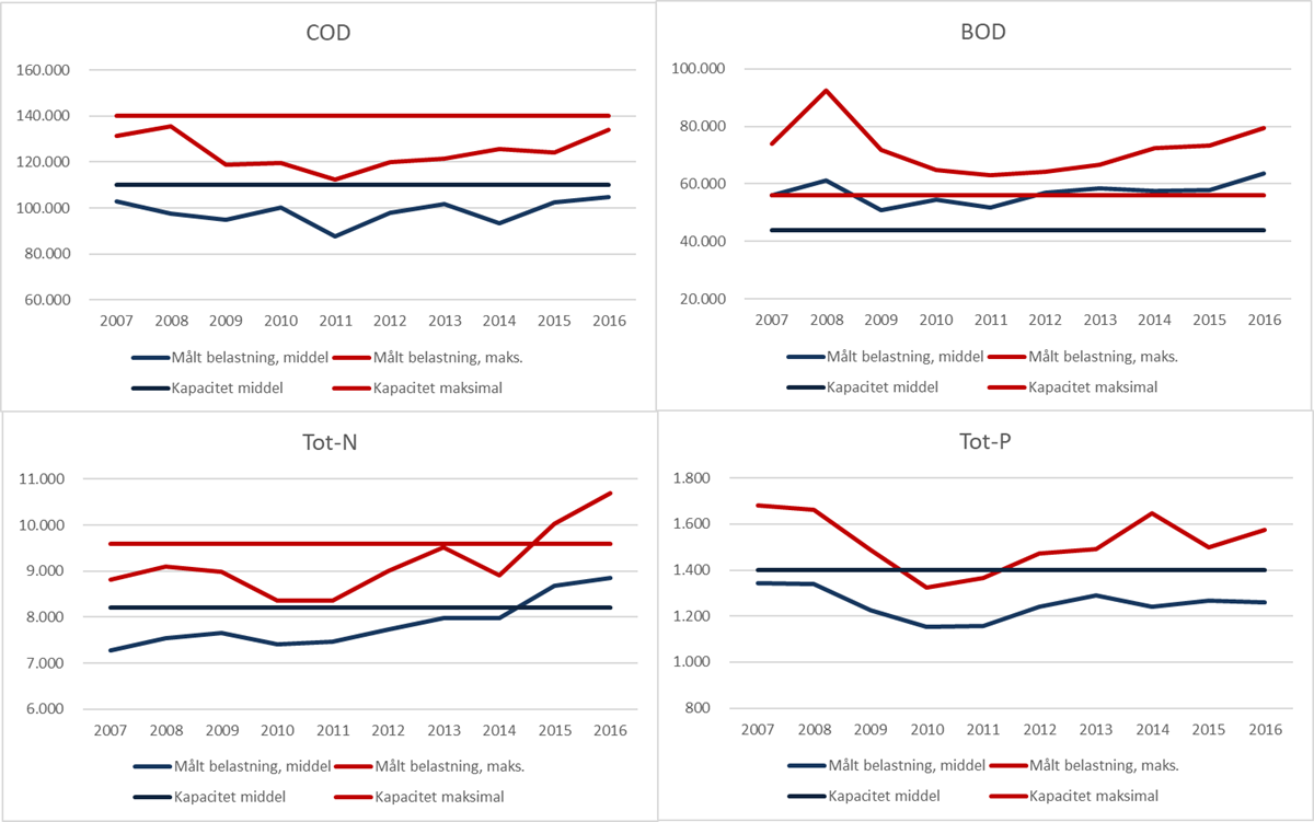 Kurverne nedenfor viser belastningen af anlægget samt anlæggets grænsen for hvor meget stof, der kan fjernes. Overskridelserne har ikke ikke medført væsentlige problemer med overholdelse udledningstilladelsens krav.